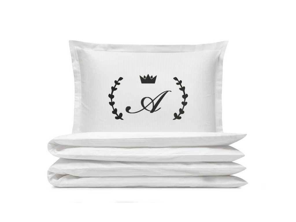 Pojedynczy komplet białej pościeli adamaszkowej z indywidualnym haftem na poduszce.