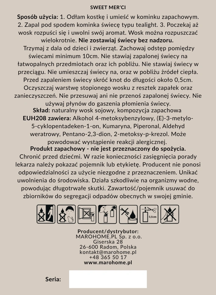 Każdy wosk powstaje u nas, w małej pracowni w Radomiu — od topienia, przez łączenie zapachów, po naklejanie etykiet. To praca rąk, nie maszyn. Drobne bąbelki czy minimalnie przekrzywiona etykieta to ślady rzemiosła, a nie wady.