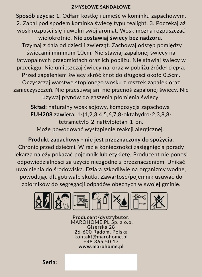 Każdy wosk powstaje u nas, w małej pracowni w Radomiu — od topienia, przez łączenie zapachów, po naklejanie etykiet. To praca rąk, nie maszyn. Drobne bąbelki czy minimalnie przekrzywiona etykieta to ślady rzemiosła, a nie wady.