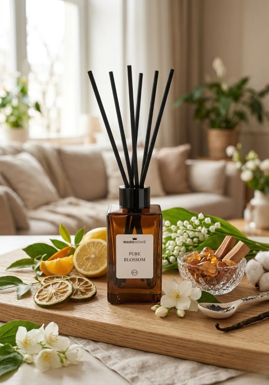Każda kompozycja MARO HOME powstaje z wysokiej jakości olejków zapachowych, dzięki czemu zapach jest stabilny, nasycony i utrzymuje się nawet do 8–10 tygodni (w zależności od warunków w pomieszczeniu). Patyczki z włókien rozprowadzają aromat w sposób ciągły, tworząc subtelne tło: wyczuwalne, ale nie nachalne. Wnętrze zyskuje bardziej dopracowany charakter, a atmosfera staje się spójna i harmonijna.