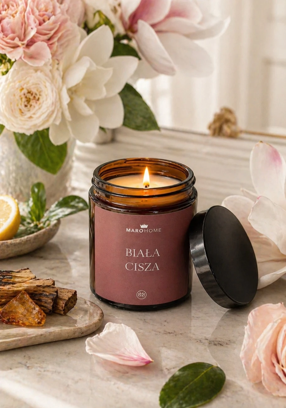 Biała Cisza to zapach jasny, kobiecy i niezwykle elegancki. Otwiera się świeżą zielenią, cytrusową lekkością i delikatnym kwiatowym akordem, który wprowadza do wnętrza czystość i spokój. W sercu kompozycji rozkwitają róża, gardenia i magnolia, miękko otulone owocową subtelnością. Całość osiada na ciepłej bazie piżma, drewna i bursztynu, dzięki czemu zapach staje się bardziej zmysłowy, spokojny i przytulny.