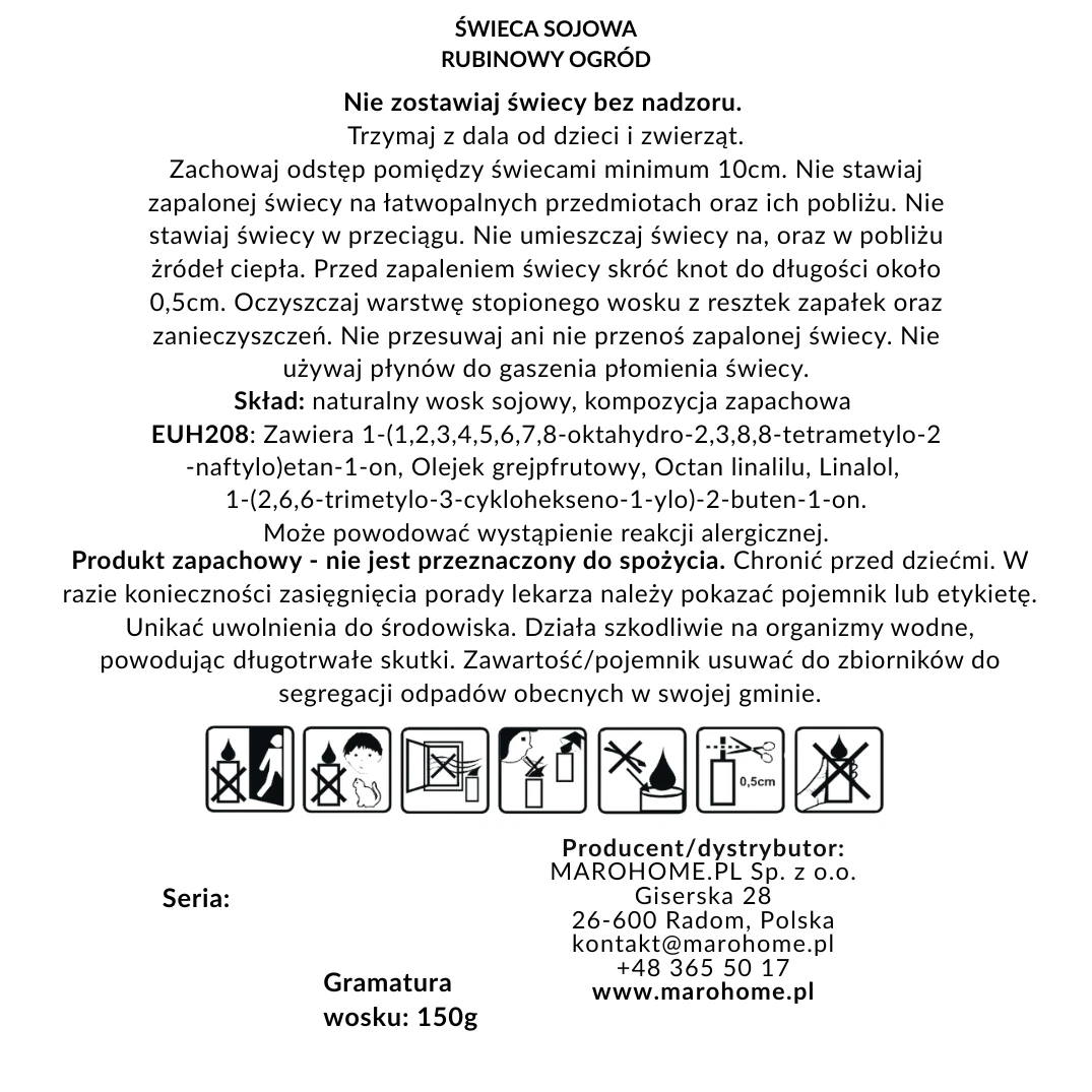 • Nie pozostawiaj zapalonej świecy bez nadzoru. Trzymaj ją z dala od dzieci, zwierząt, przeciągów oraz łatwopalnych materiałów. Nie przenoś świecy, gdy jest zapalona lub gdy wosk jest jeszcze płynny.