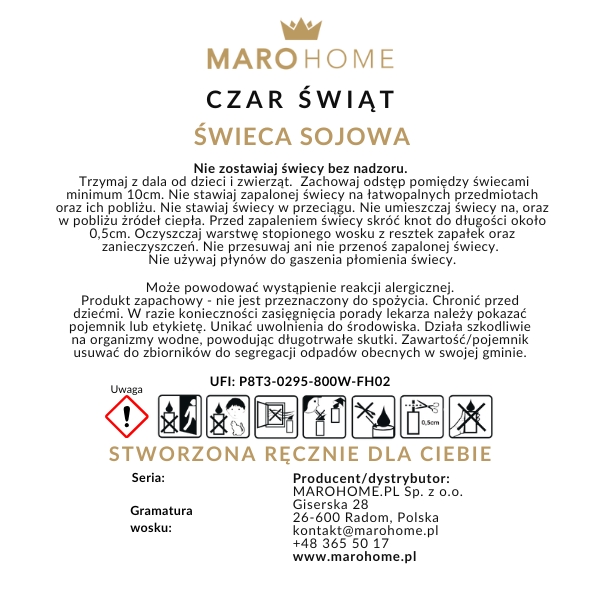 Informujemy, że karta charakterystyki (MSDS) dla naszych świec jest dostępna na życzenie. Jeśli są Państwo zainteresowani uzyskaniem informacji w niej zawartych, prosimy o kontakt z naszym zespołem obsługi klienta. Z przyjemnością udostępnimy dokumenty, aby zapewnić pełną przejrzystość i bezpieczeństwo użytkowania naszych produktów.