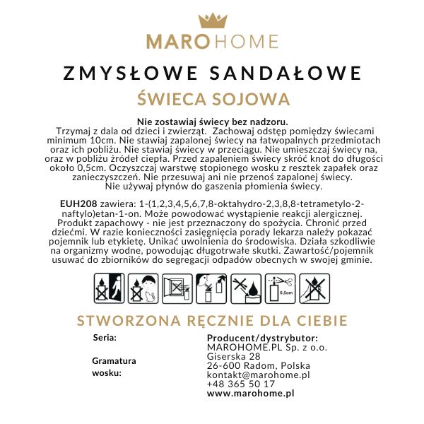 Informujemy, że karta charakterystyki (MSDS) dla naszych świec jest dostępna na życzenie. Jeśli są Państwo zainteresowani uzyskaniem informacji w niej zawartych, prosimy o kontakt z naszym zespołem obsługi klienta. Z przyjemnością udostępnimy dokumenty, aby zapewnić pełną przejrzystość i bezpieczeństwo użytkowania naszych produktów.